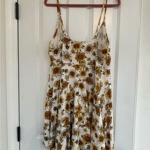 Charming midi dress with sunflower pattern. Features a flattering fit and spaghetti straps. Ideal for sunny days.