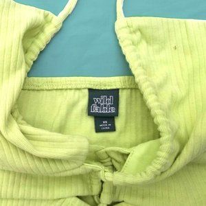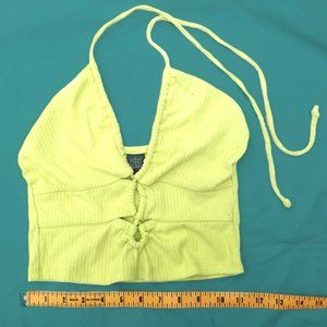 The brand Wild Fable is Lime green halter top, Size XS. Stretchy, wide ribbed T-shirt material. Has open areas in front bodice with laces to adjust the spacing width. Photo shows area with no slack in lace.