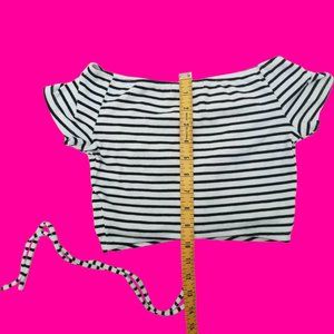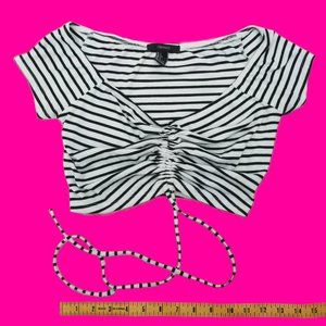 Get a great deal on two tops. The brand Forever 21 summer top is black and white stripe, US size S. Stretchy, ribbed T-shirt material. Has gathered bodice with draw string laces to adjust and tie at hem line.