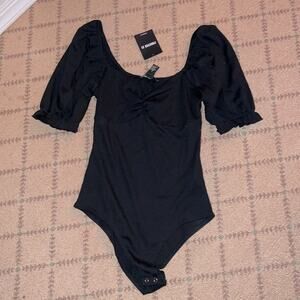 Forever 21 black ribbed knit bodysuit NWT S. round ballet neckline in front and back. Puffed sleeves w elastic and small ruffle detail. 2 snaps at bottom of body suit