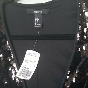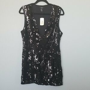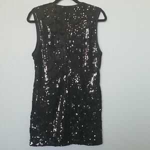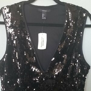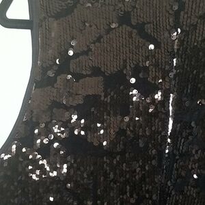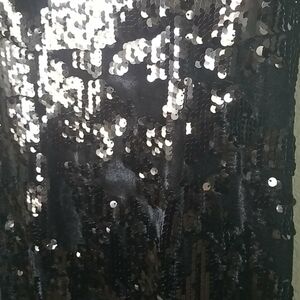 Please note there are spaces where there are no sequins so it is not fully sequined. I dont know if they fell off or what I dont see any obvious indication that there were sequins there. So just be aware of this. Its a soft fuzzy fabric where theres no sequin. Dress is lined, has a hidden side zipper closure. V neck. Fabric does stretch.