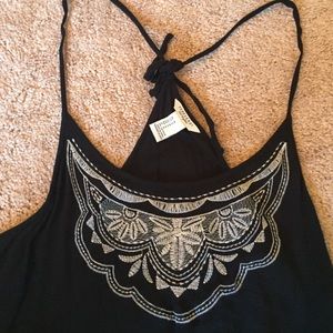 Black tank top with white design on collar. Spaghetti traps that tie in the back with knot. Good condition, worn once. Cleanliness guaranteed and no stains