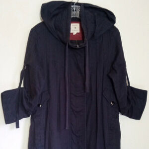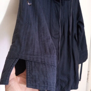 Very unique lightweight jersey lined hooded jacket from Forever 21. 3/4 sleeves, ornate stitching, and drawstring hemline. 4 exterior pockets and zips and snaps close. This is an older jacket and has some normal wear. Besides normal wash wear there is a faded line that is only noticeable when you unsnap the jacket. It is located along the inside of the fabric that covers the zipper. Pics are posted of this. There is also piling on the jersey lining.