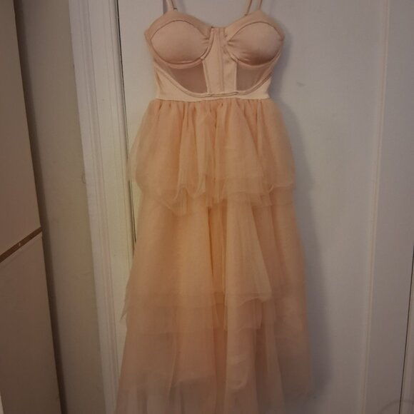 Romantic and feminine Forever 21 satin dress featuring soft blush-peach tones, a Madonna Brassiere and delicate tiered tulle layers. The midi-length silhouette has a flowy, flattering fit that’s perfect for weddings, parties, or special occasions. Lightweight satin bodice with a dreamy tulle skirt gives it that effortless fairytale look.