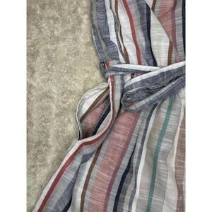 Multicolored striped pattern; strapless; sleevesless; elastic neckline and waistband w/ tie waist; two on-seam pockets