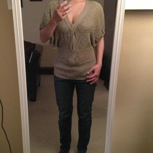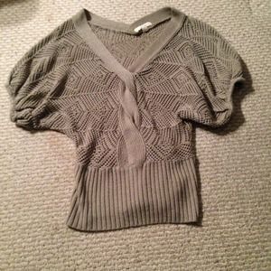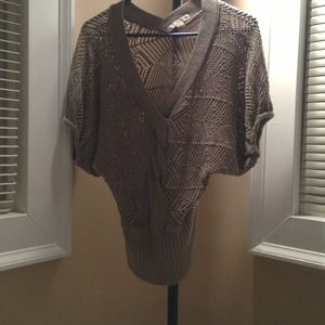 Small taupe bat wing sweater with braided front detail and banded bottom. Surprising warm. Easy to dress up or down.