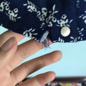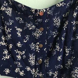 This beauty has a blue and white floral pattern with buttons up the front, a zipper, and adjustable straps! There is a little tear in the front but can be easily sewn back in place and is actually barely noticeable when on. Size medium but can fit an xs and a small too depending on how loose you want the fit.