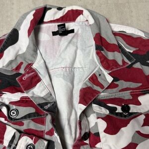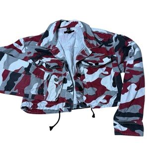 This Forever 21 utility jacket combines a bold red and black color scheme with a practical design, perfect for transitional weather. Its lightweight material and adjustable features make it a versatile addition to any wardrobe, offering both style and functionality.