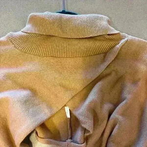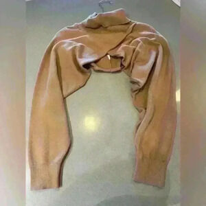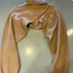 Color is tan, stock photos show how it fits. Turtle neck and cropped