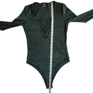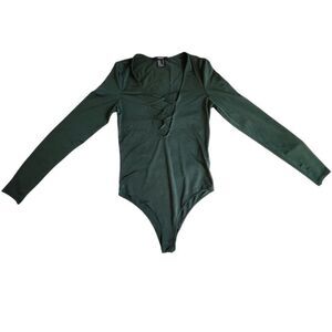Brand: Forever 21. Occasion: Casual. Any. Size Type: Regular. Size (Women's): M. Material: 96% polyester 4% spandex. Neckline: Deep plunge. Caged plunge. Lattice neckline. V-neck. Style: Bodysuit. Sleeve Length: Long sleeve. Color: Dark green. Hunter green. Pattern: Solid. Features: Snap button closure at the crotch. Deep plunging v neckline with lattice loops. Semi-sheer.