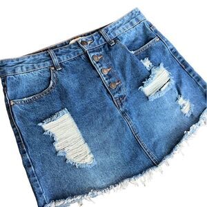 Forever 21 denim mini skirt button up fly distressed raw hem size 28
