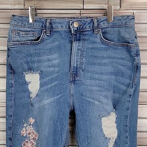 Cotton spandex blend slim fit low rise cropped jeans by Forever 21 manufacturer distressed with floral embroidery patches. Great pre-owned condition.