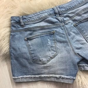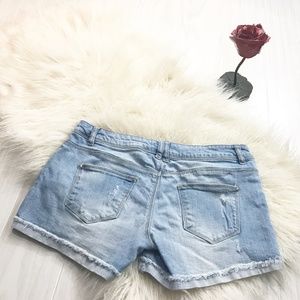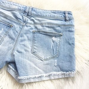 Distressed pair of Forever 21 jeans shorts. Zipper fly.