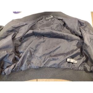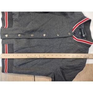 Forever 21 gray and red varsity collegiate jacket. Red banded neck, cuffs and waistband. Wool look - poly nylon acrylic blend. Two pockets. Snap front. There is minor scuffing on the snaps.