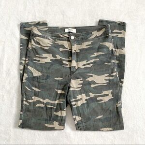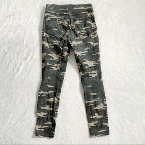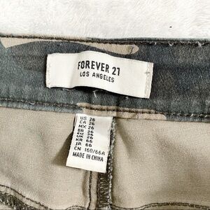 In excellent preowned condition, green camo distressed knee skinny jeans from the brand Forever 21. Size 26. Material is comfy and has a slight stretch to it. Has deep front and back pockets and a zipper fly front.