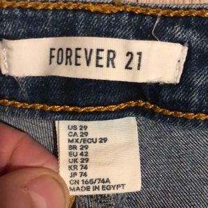 Forever 21 brings you these great medium wash jeans. Crafted from recycled cotton, this pair of skinny jeans features a high rise, zip closure, knee holes, distressing at front & back pockets, five-pocket construction, and belt loops. 98% recycled cotton, 2% spandex - Machine wash cold. Junior size 29 (see pics for measurements). My daughter wore them only once before deciding she no longer would wear jeans of any kind. : (