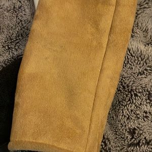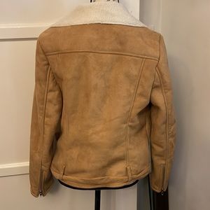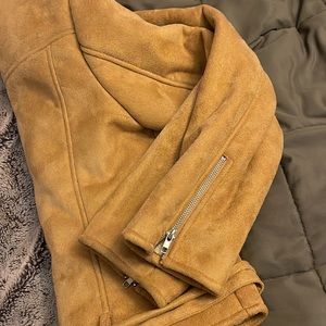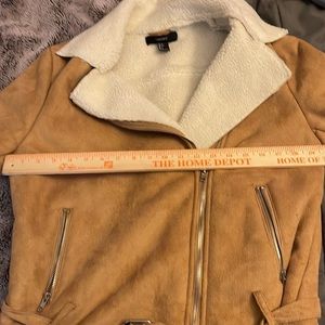 Forever 21 sheepskin jacket feels like suede on the outside two front pockets that zip up it’s up straight down the middle there is belt at the bottom part of the waste it is adjustable there are some marks on the sleeves I did take a picture I’m not sure if it’s stain or if you can wash it out thank you for looking