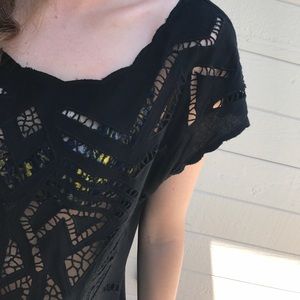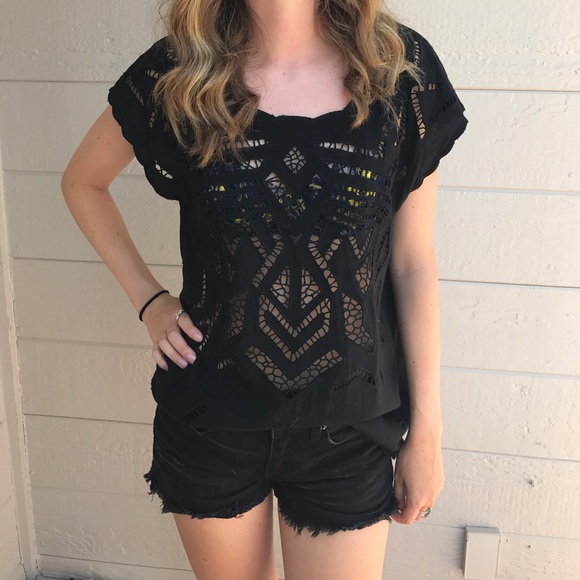 Lace detail in the front and sold back in black. Super thin and comfy! Perfect for dressing up or wearing with jeans and some cute shoes! Size small but could fit an xs- medium.