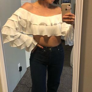 Forever 21 long sleeve crop top. Festive ruffle look. Has a soft layer underneath the ruffles. I ripped the tag off but it is a size small. Used in good condition.