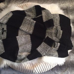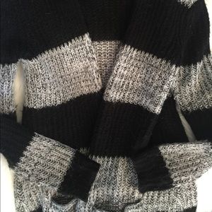 A fuzzy-knit long cardigan featuring an open-front, an allover stripe pattern, long sleeves, front slip pockets.