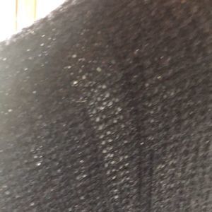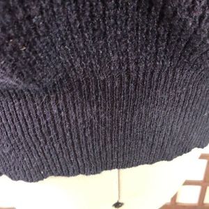 Navy sweater has a nubby texture and a loose knit. It has ribbing at the waist and ends of sleeves. The back is longer than the front. Has a boxy look.