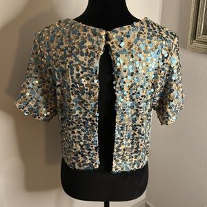 Forever 21 nude sequins aqua tan open back short sleeves Sz L