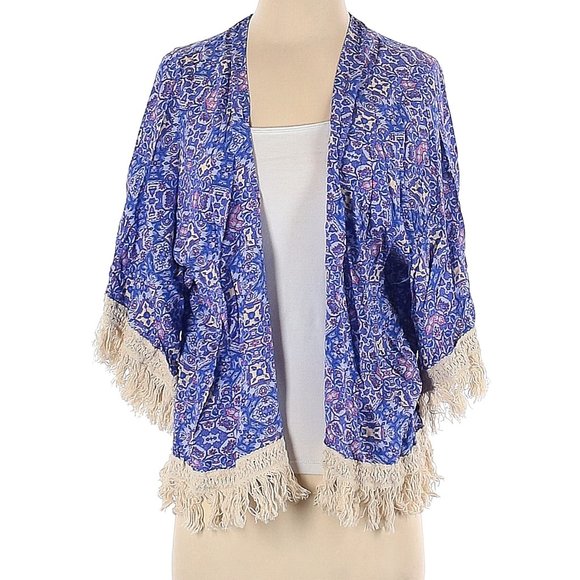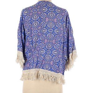 a Forever 21 patterned fringe kimono. The fringes are cream macrame and the pattern looks beautiful, reminds me of stained glass! Very 60's/70's, beachy and boho. Pictured with celebrity Shelley Hennig from Teen Wolf and her friends. Her friend is wearing the same one. Can fit a S-L, loose fitting. Perfect for a music festival or summer vacation!