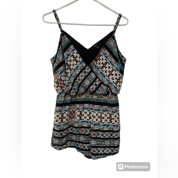 Size small, patterned, polyester size small romper. Does have a stretchy waistband. Very cute. A few minor pulls but plenty of life left