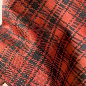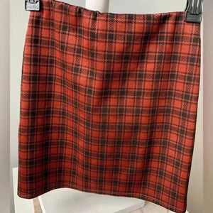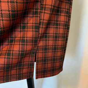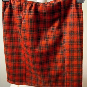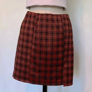 Forever 21, red and black plaid pattern, elastic waist, poly/rayon blend, side slit, size Xs, length 15”, waist 25”, good condition, made in China