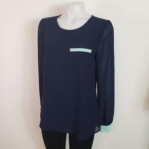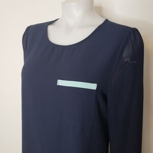 Forever 21 sheer navy button back long sleeve top mint trim size small