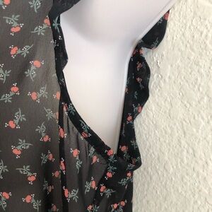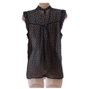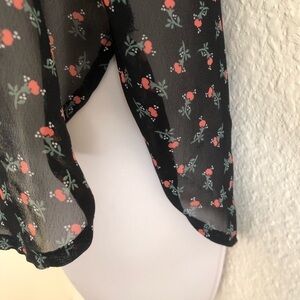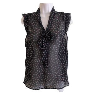 Forever 21 sleeveless black blouse with floral print, size small, tie in front, pleated back, cap sleeves, high low hem, sheer.