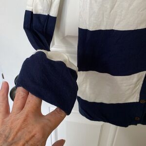 Lightweight navy and white stripe sweater. Full button up front. This is a nice casual piece for early fall or to use as a layering piece as it gets colder. Goes over hips for me at 5.4 height