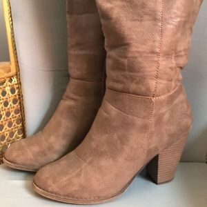 Forever 21, taupe faux leather, distressed look, chunky heel 3.5”. Pull on boots. Rounded toe.