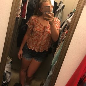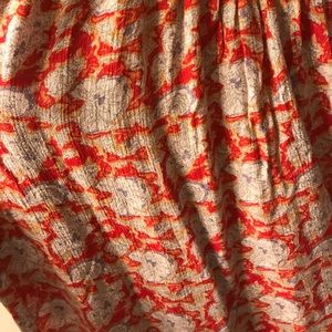 Red top with slight V-neck. Has white/purple flower pattern and is flowy. Still has tags on it.