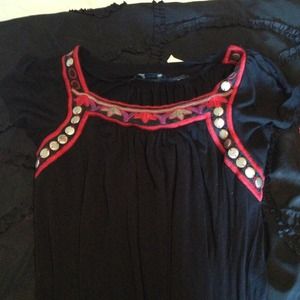 Black with beads and red accents, ties at the bottom and a tunic. Short t-like sleeves. Worn once