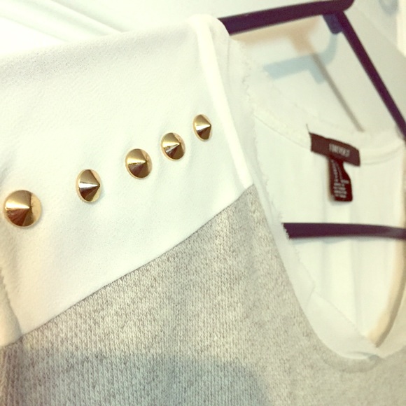 Gray sweater front, cream sheet back, gold studs on shoulders. Adorable over leggings! Size small, but fits like a medium. Never worn.