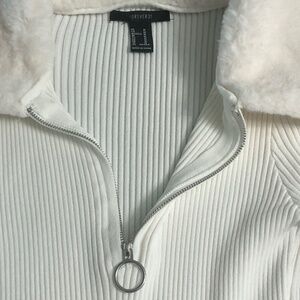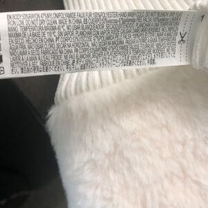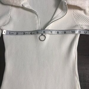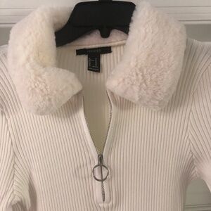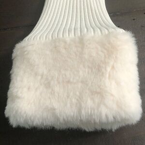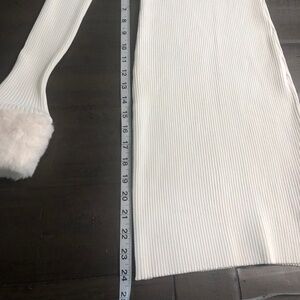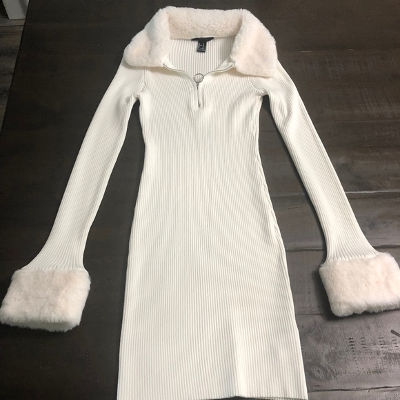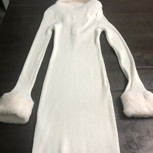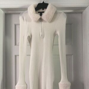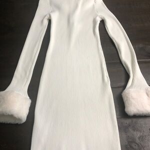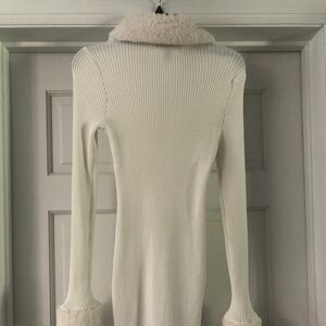 Great condition winter woman dress, light cream, size Medium JR, long sleeve, material 53% rayon, 47% nylon, faux fur detail in collar and sleeve