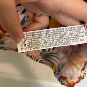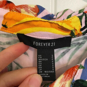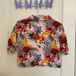 Women’s Forever 21 shirt. Shirt is tropical patterned with pink background. Full front button with cropped cut. Size small. Smoke free home!