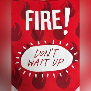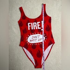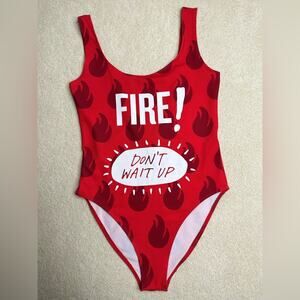 Vibrant red one piece with bold fire print. Features playful text design. Comfortable and stylish.