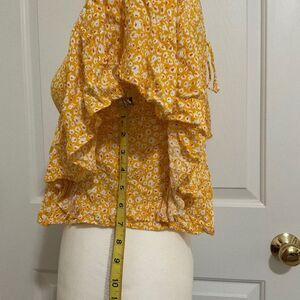 Bright and cheerful forever, 21 floral crop top and a yellow floral print. Features flutter sleeves, button-and front closure, deep V neckline, and a flowy fit with a cinched waist for a flattering look. Perfect for summer, festivals, or layering with high waisted, jeans or shorts. 100% rayon. Gently preowned. An excellent condition. Smoke-free home. Fast shipping.