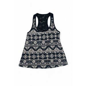 Trendy Forever 21 racerback tank top featuring an Aztec-inspired geometric print and lace back detail.