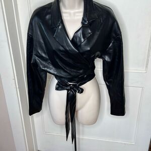 A Soft buttery faux leather moto jacket featuring notched lapels, a wrap design with a back self-tie closure, dropped long sleeves, and cropped hem.