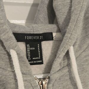 This stylish gray sweater from Forever 21 features a cropped design with a convenient zip-up front. Made from a comfortable cotton blend, it offers a fitted silhouette with long sleeves and ribbed cuffs, making it a versatile addition to any wardrobe.