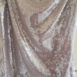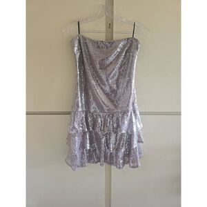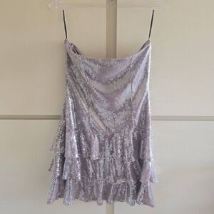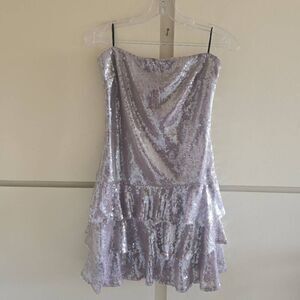 Strapless tube sequin dress in a grayish lavendar, fully lined, 3 tier ruffle skirt.