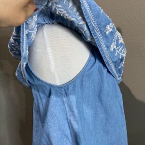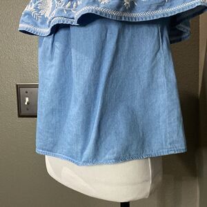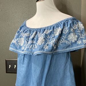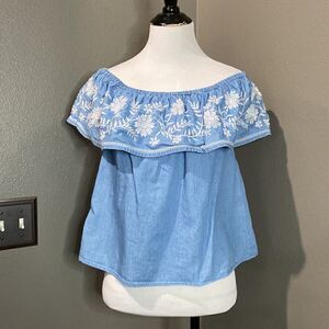 Forever 21 Off Shoulder Blouse White Floral Embroidery Chambray Denim Top