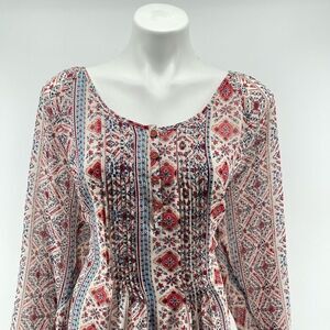 Embrace your boho dreams with this Forever 21 Plus Size tunic top, perfect for festival season, summer days, or laid-back weekends. This lightweight, sheer beauty features a southwestern-inspired print, pleated button front placket, a flattering peasant-style silhouette, and a stylish tie-back detail. Flowy and breathable, it’s perfect for layering over a bralette, tank, or swimwear.