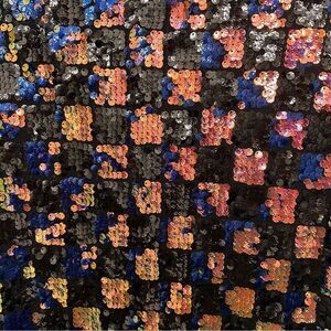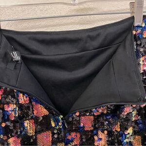 This bright skirt is from Forever 21. The item is lined. The skirt is covered in colorful sequins. The back has This item is perfect for an evening out. The shell is made out of 95% polyester and 5% spandex. The lining is out of 100% polyester. The size is medium. The measurements are 17” L x 14” waist (measured lying flat). The skirt was gently worn but is in very good condition.