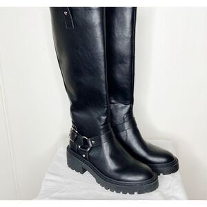 A pair of faux leather boots featuring a knee-high length, pull tabs, almond toe, high-polish stud embellishments and O-ring, zippered side closure, lug sole, and low block heel.
