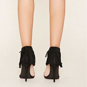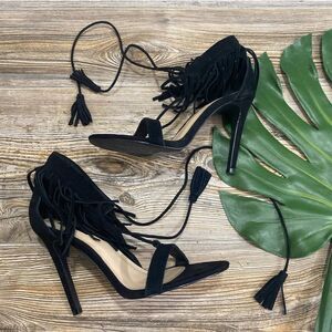 Forever 21 black fringe lace up heels. Black suede fringe around the heel. Lace up strappy tassle detail. 4.5” heel