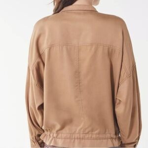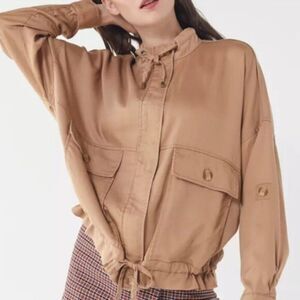 Stay stylish and comfortable with this versatile tan utility jacket. Perfect for layering, it features practical pockets and a drawstring waist for a customizable fit.